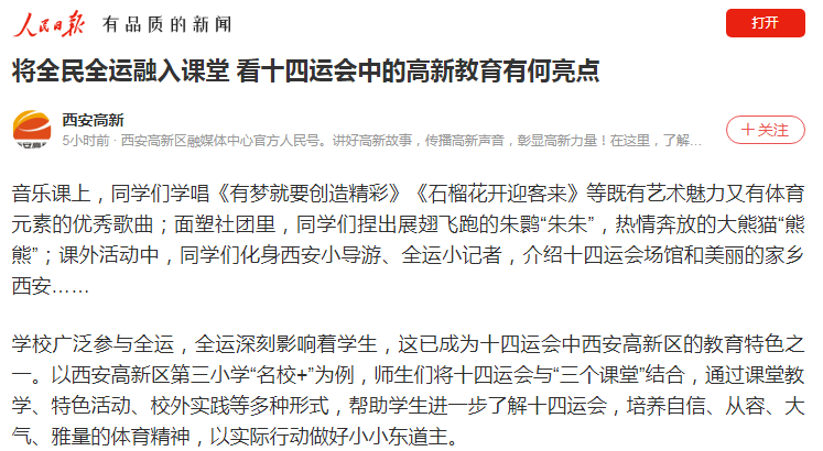 学校广泛参与全运,全运深刻影响着学生,这已成为十四运会中西安高新区的教育特色之一。以西安高新区第三小学“名校+”为例,师生们将十四运会与“三个课堂”结合,通过课堂教学、特色活动、校外实践等多种形式,帮助学生进一步了解十四运会,培养自信、从容、大气、雅量的体育精神,以实际行动做好小小东道主。